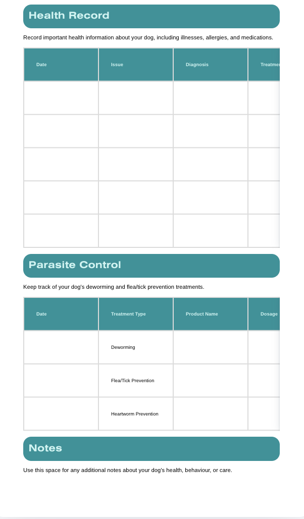 Preventive care is key to long-term health. This page helps you track tick and flea prevention, deworming, heartworm care, grooming routines, hygiene, and dental care—all in one easy-to-use format. There’s no pressure to fill it monthly; update it whenever needed.